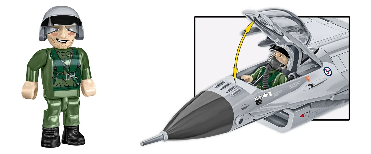 Unique Pilot Figure - The pilot is equipped with a helmet and oxygen mask with hose, dressed in a flight suit and printed with Norwegian Air Force patches.