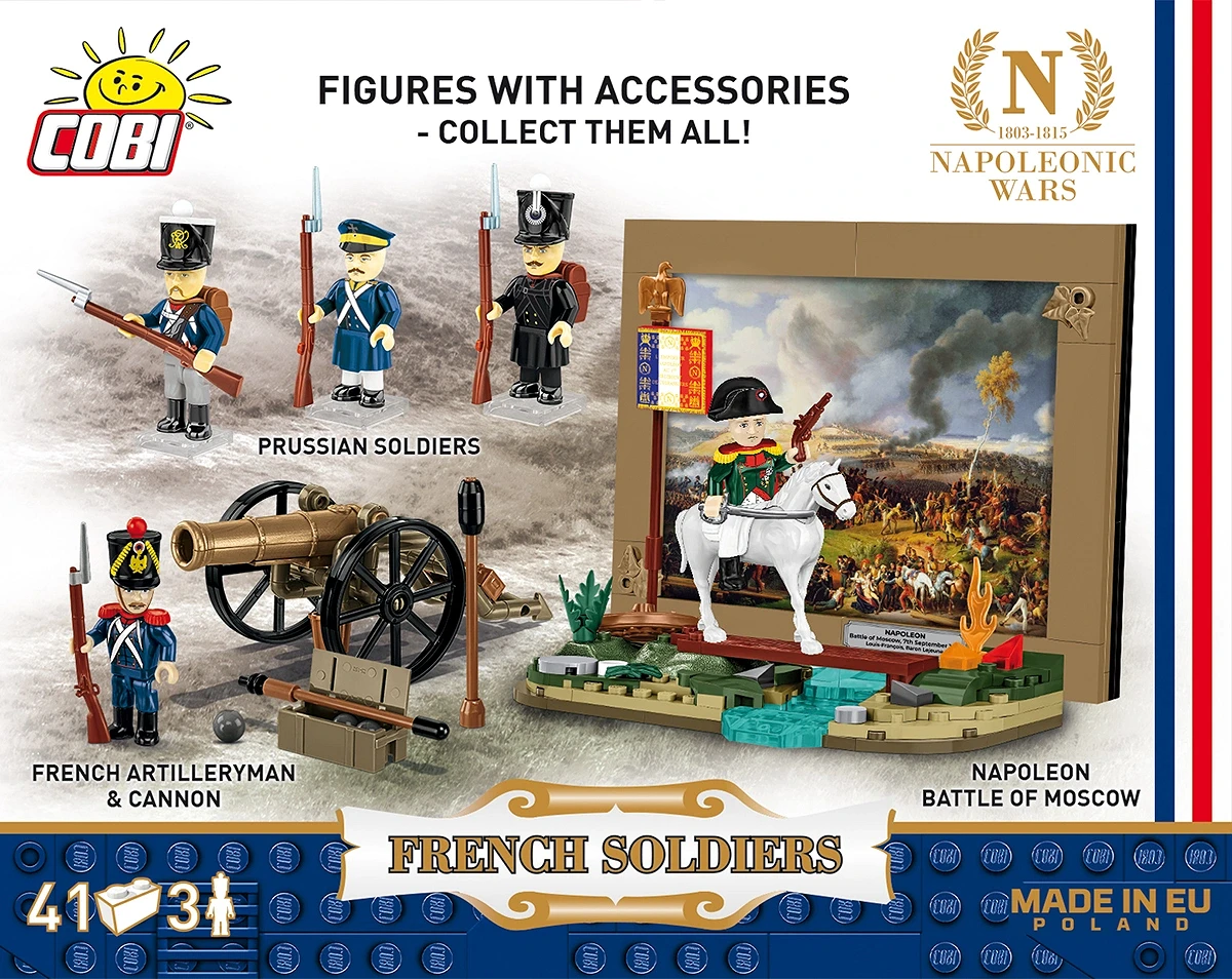 New elements – For the NAPOLEONIC WARS collection, completely new sets of accessories adapted to the realities of the Napoleonic era have been prepared. New shako caps, epaulets, backpacks, rifles with bayonets, pompoms and unique and durable prints. For every history enthusiast – this set is suitable for both play and display. Ideal for children over 5 years old and adult collectors who want to build Napoleonic Wars dioramas for their collection.