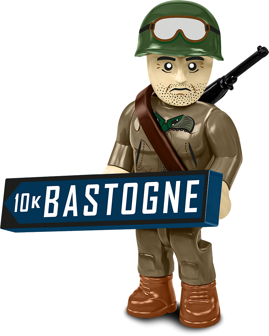 Additional environmental elements - The set includes numerous collectible accessories for display or building a diorama depicting a crossroads and soldiers preparing for action. Build a road sign leading to towns located in the Ardennes offensive area. An interesting element of the scenery is a power pole with broken wires and a warning sign. An improvised camp is located around the vehicle, containing barrels, crates and a table with a radio, mess kit, cups and a bottle.