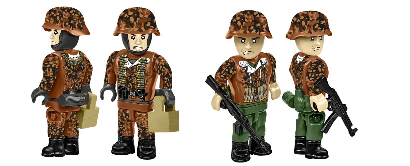 • Two Panzergrenadiers – figures in classic German Stahlhelm helmets and camouflage uniforms. One is armed with an StG 44 assault rifle and is sitting on a motorcycle, ready to deliver a message. The other is an MG 42 machine gun operator. Available exclusively in this set!